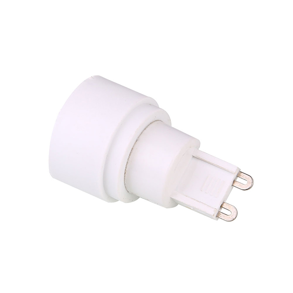 Adaptador para usar en lámparas de casquillo G9, normalmente utilizado por halógenas de 220V, a rosca fina E14. Permite usar bombillas de rosca E14 en la lámpara que antes usaba las G9.