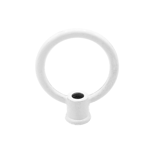 Argolla fabricada en metal pintada de color blanco. Con rosca hembra para roscarla al portalámparas o lámpara y poder colgar en el techo.