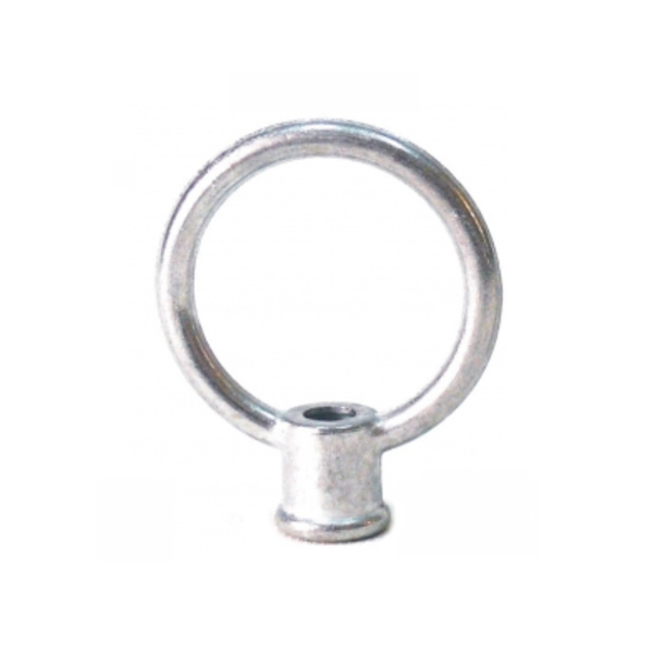 Argolla fabricada en metal (zamak) en acabado gris plateado. Con rosca hembra para roscarla al portalámparas o lámpara y poder colgar en el techo.