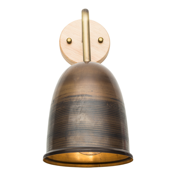 Aplique de pared combinado de madera y latón. La base de la pared es de madera clara, el brazo de latón y la campana de latón envejecido de 120mm de diámetro. Un aplique de materiales nobles ideales para ambientes rústicos renovados donde se cuidan con precisión los detalles. Este aplique de pared tiene un marcado carácter intimista por la calidad de luz que desprende, suave y dorada.