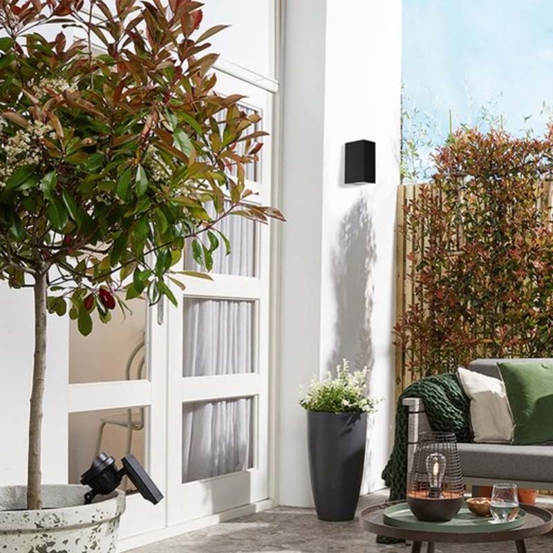 De diseño moderno, ideal para entradas de casas o terrazas. Ilumina hacia arriba y hacia abajo.