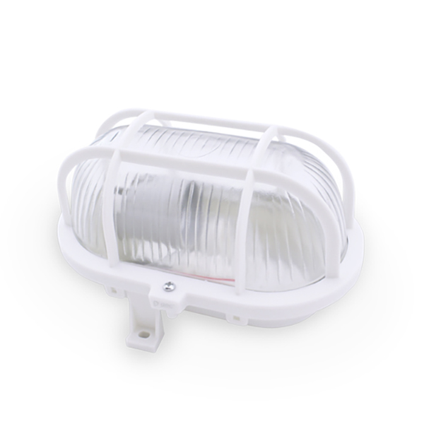 Aplique de exterior ovalado. Con base y reja de plástico blanco. Difusor de cristal translúcido.