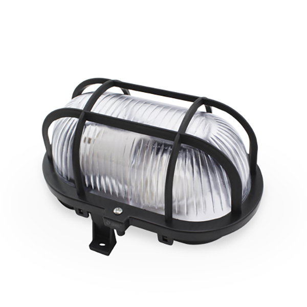 Aplique de exterior ovalado. Con base y reja de plástico negro. Difusor de cristal translúcido.