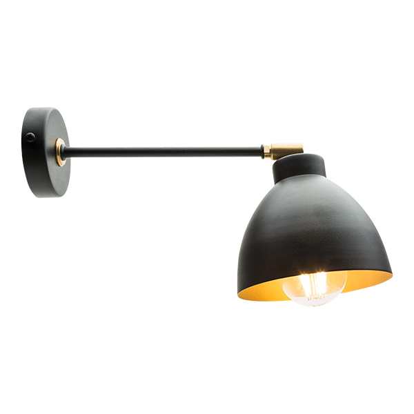 Aplique de pared metálico compuesto de base negra, brazo negro, rótula dorada y campana metálica interior dorado. Elegante aplique de pared con una clara referencia a los años 50. Combina el negro mate con pequeños detalles de latón, su campana metálica de forma clásica se puede orientar para dirigir mejor la luz hacia el espacio deseado. Ideal para iluminar el sofá, o la cabecera de la cama.