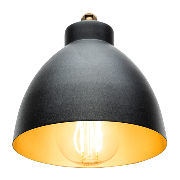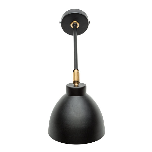 Aplique de pared metálico compuesto de base negra, brazo negro, rótula dorada y campana metálica interior dorado. Elegante aplique de pared con una clara referencia a los años 50. Combina el negro mate con pequeños detalles de latón, su campana metálica de forma clásica se puede orientar para dirigir mejor la luz hacia el espacio deseado. Ideal para iluminar el sofá, o la cabecera de la cama.