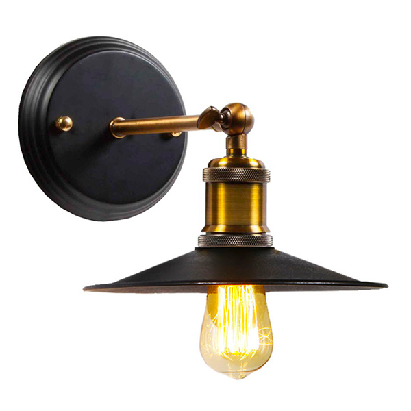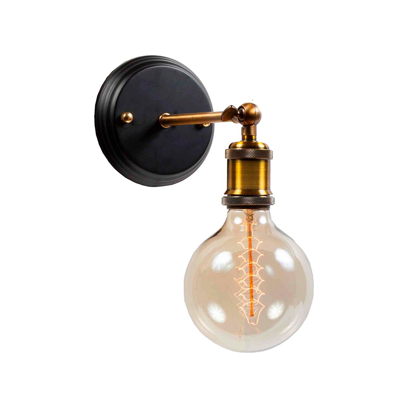 Aplique de pared decorativo de diseño clásico. Fabricado en metal. Base de pared en color negro. Brazo y portalámparas de color dorado pavonado.  Con rótula para poder orientar el portalámparas.