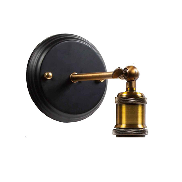 Aplique de pared decorativo de diseño clásico. Fabricado en metal. Base de pared en color negro. Brazo y portalámparas de color dorado pavonado.  Con rótula para poder orientar el portalámparas.