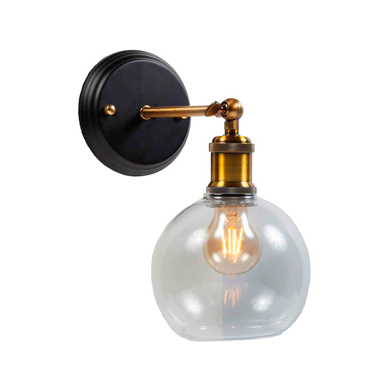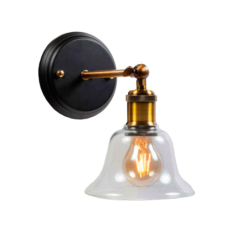 Aplique de pared decorativo de diseño clásico. Fabricado en metal. Base de pared en color negro. Brazo y portalámparas de color dorado pavonado. Con rótula para poder orientar el portalámparas.