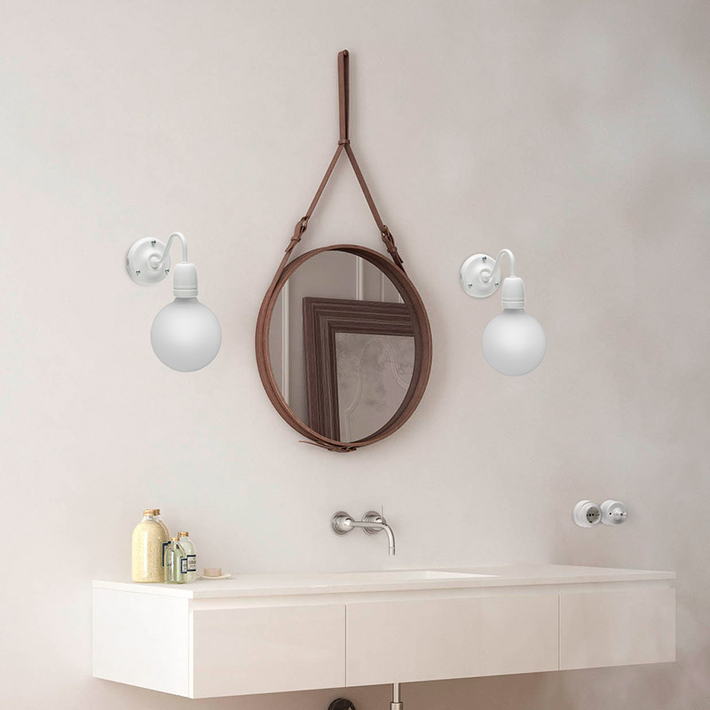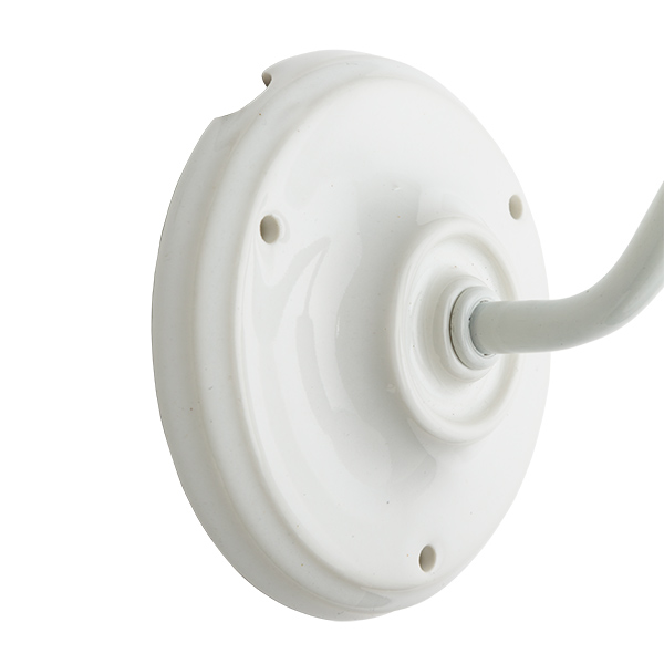 Aplique de pared en porcelana blanca. En su diseño se mezcla el clásico brazo curvado con el toque moderno del portalámparas de porcelana y la bombilla “al aire”. Compuesto de soporte de pared en porcelana blanca, brazo metálico lacado en blanco y portalámparas también de porcelana blanca. Transmite serenidad y calma. Ideal para decorar baños; colocado a ambos lados del espejo no sólo ilumina, sino que a la vez decora, creando un ambiente contemporáneo. Si se busca un efecto más retro y el espejo no es muy grande queda perfecto centrado, permitiendo que la luz reflejada en el espejo se multiplique. Con sus líneas suaves este aplique brilla en cualquier rincón. La bombilla recomendada es un globo LED de 95mm de diámetro.