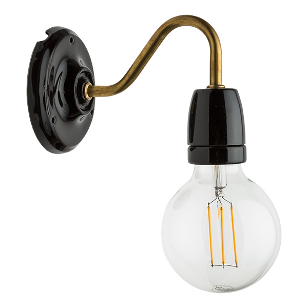 Aplique de pared con soporte en porcelana negra a juego con el portalámparas también negro. Combinado con el clásico brazo curvado de latón natural para acabar con una bombilla globo gigante, de esta forma se crea una combinación muy moderna y atractiva. Aplique de pared de pequeñas dimensiones ideal para iluminar recibidores, pasillos, lavabos, distribuidores, dormitorios, ect.