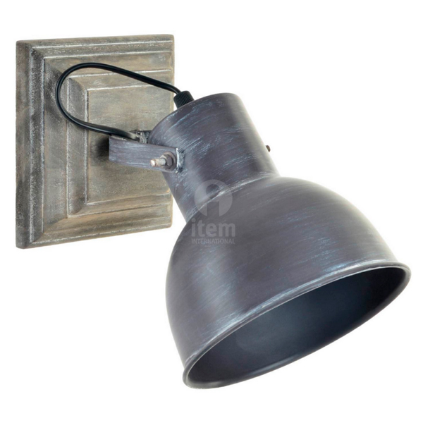 Lámpara de pared con foco metálico orientable y base cuadrada de madera moldurada con un bonito efecto decapado. La pantalla metálica es en acabado zinc envejecido. Ideal para cabeceras de dormitorio, librerías, pasillos, etc.
