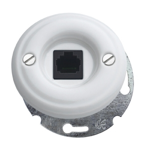 Base de porcelana con toma de datos para conector RJ-45 de 8 vías. Utilizada para conectar ordenadores y otros dispositivos a redes informáticas e Internet.