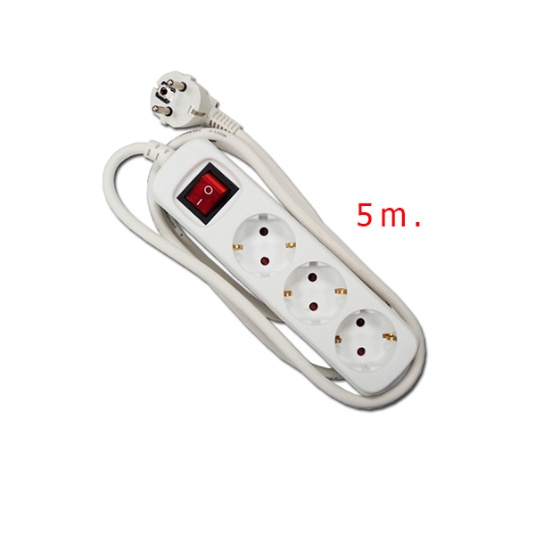 Regleta base múltiple (“guitarra”) con 3 enchufes de toma tierra, con clavija de conexión en cable de 5m. Incorpora un interruptor con indicador luminoso para desconectar todos los aparatos enchufados a la base.