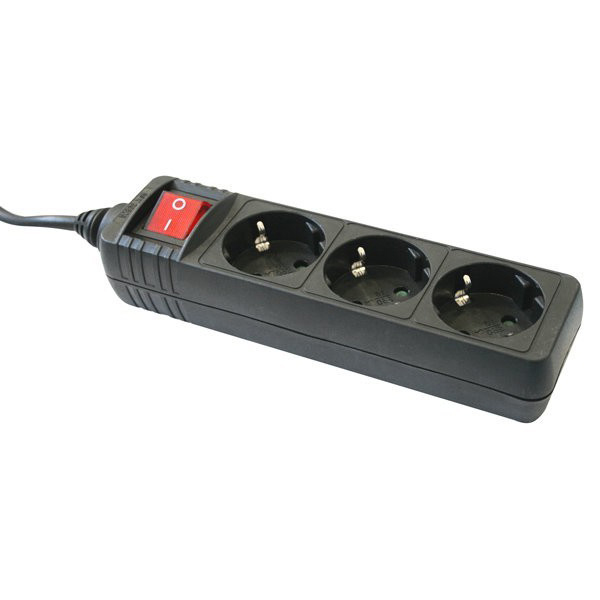 Regleta base múltiple (“guitarra”) con 3 enchufes de toma tierra, con clavija de conexión en cable de 1,5m. Incorpora un interruptor con indicador luminoso para desconectar todos los aparatos enchufados a la base.