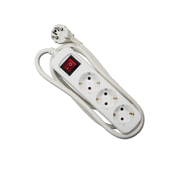 Regleta base múltiple (“guitarra”) con 3 enchufes de toma tierra, con clavija de conexión en cable de 1,5m. Incorpora un interruptor con indicador luminoso para desconectar todos los aparatos enchufados a la base.