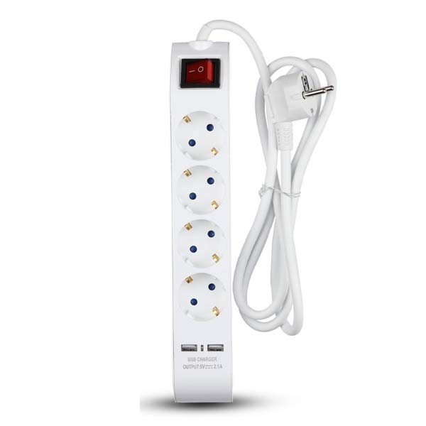 Base múltiple con 4 tomas de enchufe con toma de tierra. Incorpora 2 puertos USB para alimentar y cargar dispositivos. Interruptor con indicador luminoso.