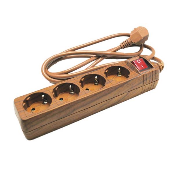 Regleta decorativa con un acabado simulando madera oscura. El cable y la clavija de enchufe son de color marrón. Regleta base múltiple (“guitarra”) con 4 enchufes de toma tierra, con clavija de conexión en cable de 1,5m. Incorpora un interruptor con indicador luminoso para desconectar todos los aparatos enchufados a la base. Sirve de alargo y de “ladrón” para conectar hasta 4 aparatos eléctricos. Los enchufes disponen de obturadores de seguridad infantil y conexión.