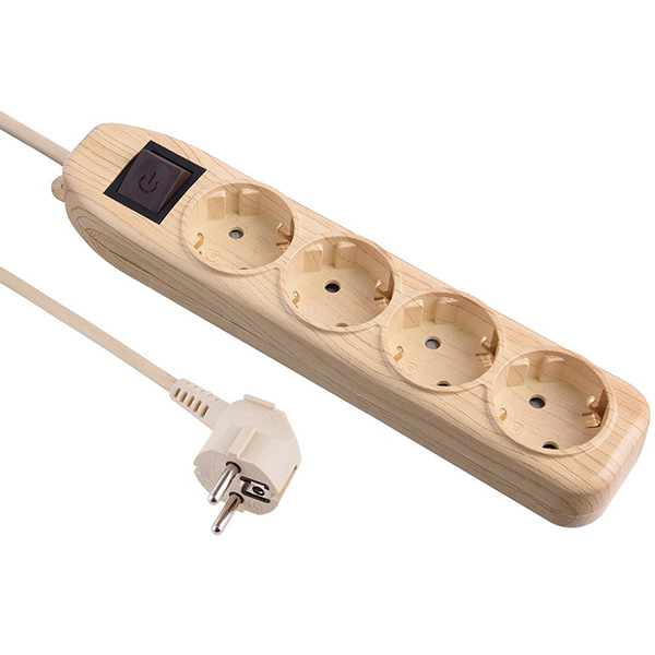 Regleta decorativa simulando a la perfección madera de pino. El cable y la clavija de enchufe son de color marfil. Con interruptor, de color marrón oscuro, e indicador luminoso de funcionamiento.
