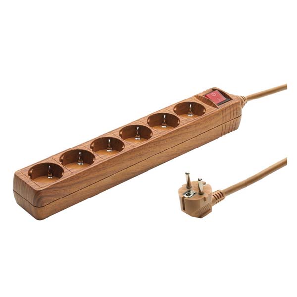 Regleta decorativa con un acabado simulando madera oscura. El cable y la clavija de enchufe son de color marrón.