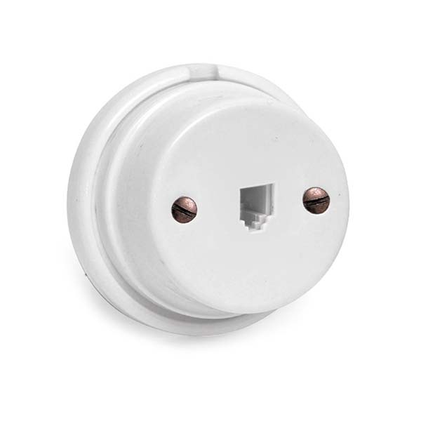 Mecanismo con toma de teléfono fabricada en porcelana de color blanco para su instalación en superficie.