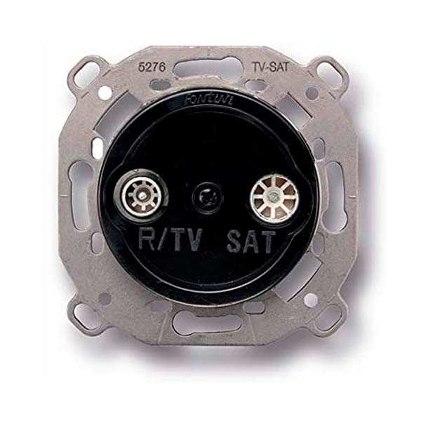 Toma señal radio, televisión y satélite. Ecualizada. Mecanismo fabricado por TELEVES. Carcasa de zamak con frontal de plástico de color negro. Para instalar empotrada, combina perfectamente con los interruptores y enchufes de porcelana de esta misma serie. Su mecanismo acepta conectores de antena estándar. Dispone de dos entradas, una para Rádio/Televisión y otra para Televisión Satelite.