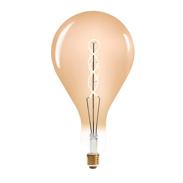 Como una bombilla estándar, pero de gran formato, 27,2cm de longitud, con un filamento LED en forma de espiral. Su LED de luz cálida, muy suave y matizada con el cristal ámbar, la convierten en una bombilla idónea para decoraciones retro.