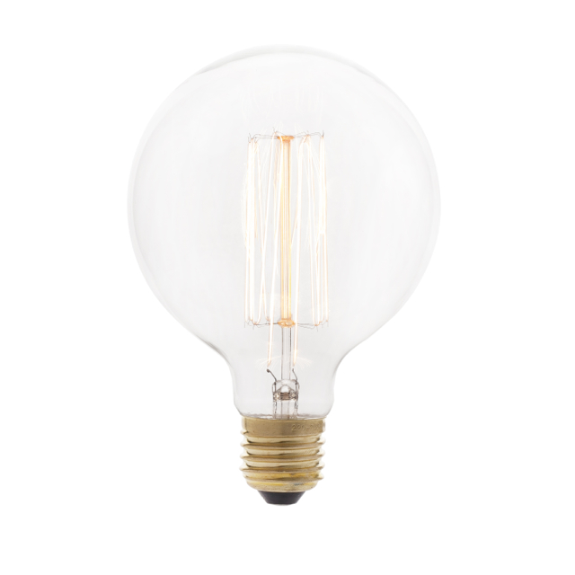 Bombilla incandescente en forma de globo de diámetro 95mm. Decorativa, de aspecto rústico. Ideal en decoraciones vintage. Filamento incandescente, como las antiguas bombillas. Cristal transparente.