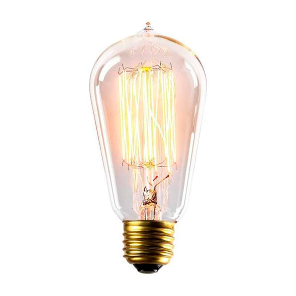 Bombilla vintage incandescente de forma ovoide. Está fabricada en cristal transparente. El pebetero es una réplica de las primeras bombillas Edison. Se trata de una bombilla decorativa, de aspecto rústico, por eso es ideal en decoraciones vintage. Tiene filamento incandescente, como las antiguas bombillas.
