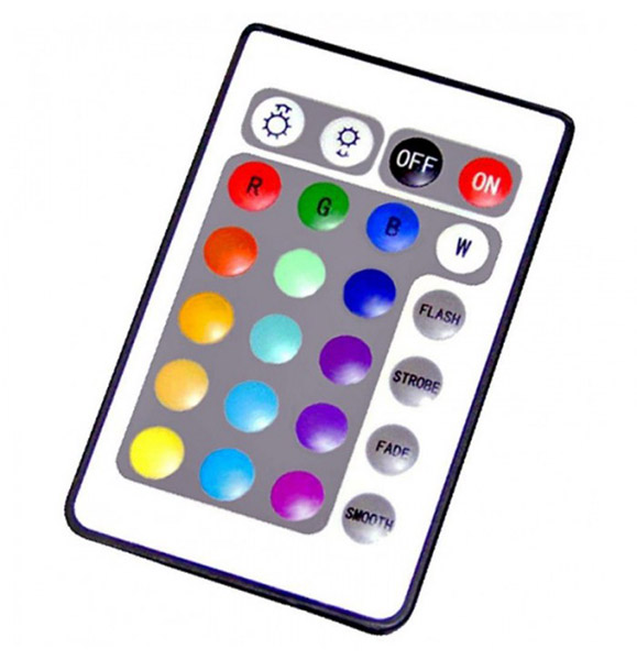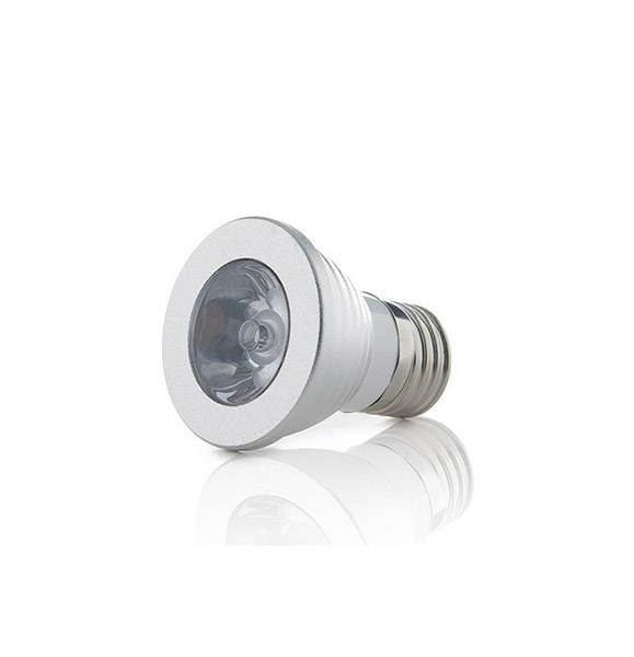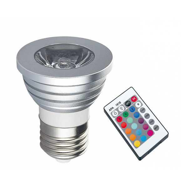 Bombilla dicroica de 3W, con LED de luz RGB (multicolor). De rosca estándar (E-27). Se controla desde mando a distancia (incluido).