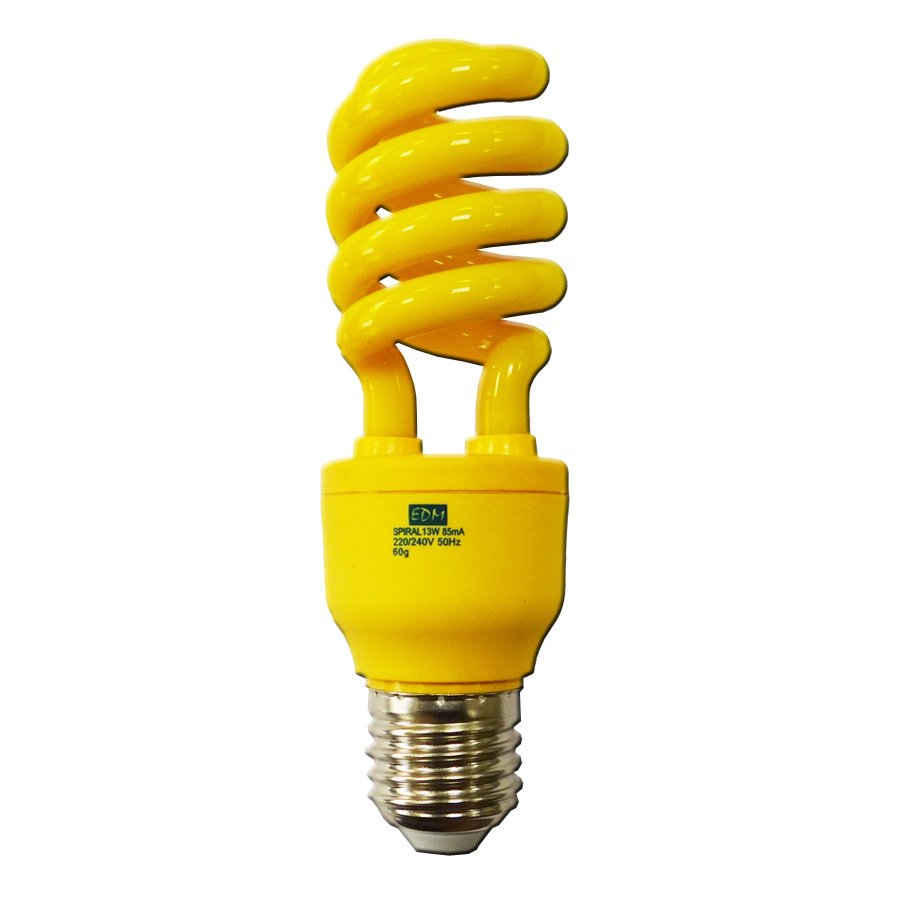 Bombilla bajo consumo en espiral de color amarillo. Ideales para verbenas, navidad y todo tipo de fiestas.