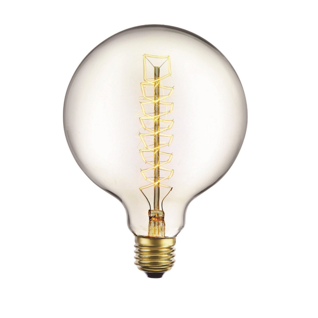 Bombilla incandescente en forma de globo de diámetro 95mm. Decorativa, de aspecto rústico. Ideal en decoraciones vintage. Filamento incandescente en forma de espiral, como las antiguas bombillas. Cristal transparente.
