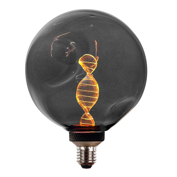 Bombilla globo, de cristal ahumado, con iluminación LED efecto cadena de ADN. Consume solo 4W y su propósito es decorativo, ideal para aplicar en lámparas de sobremesa o colgantes donde la bombilla va vista.