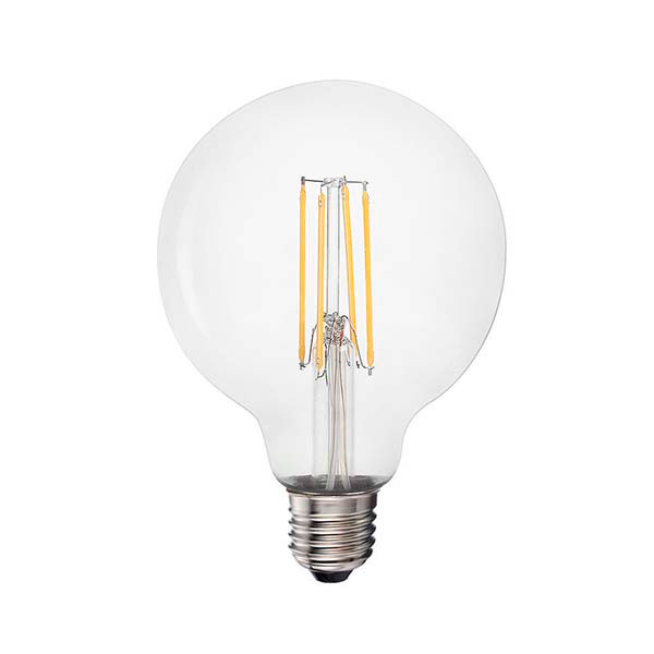Bombilla decorativa simulando a las antiguas bombillas incandescentes. Decoran, crean ambientes, iluminan. Globo de cristal transparente, de diámetro 95mm. Filamentos de micro-leds con una alta eficacia energética (reduce el consumo eléctrico hasta un 90%). Solo consumen 6W con una equivalencia de unos 60W de las antiguas bombillas.