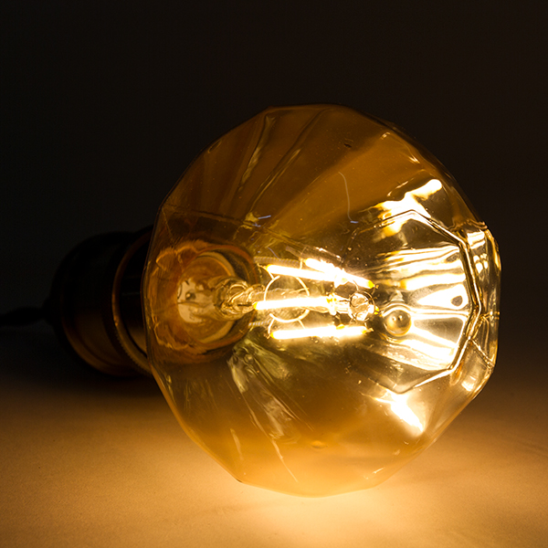Bombilla LED muy decorativa. Es un globo facetado con talla de diamante. Su cristal ámbar (color caramelo) y su luz cálida (2200ºk) crean una atmósfera cálida y relajante. Ideal para comercios, restaurantes y rincones especiales de tu hogar. Filamentos LED de 4W, con una equivalencia de unos 40W (450 lumens). Combínala con uno de nuestros colgantes donde quede la bombilla vista para destacar toda su belleza.