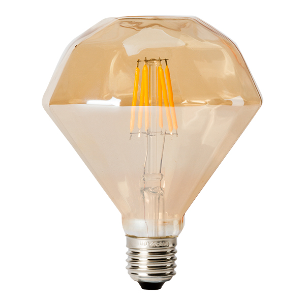 Bombilla LED muy decorativa. Es un globo facetado con talla de diamante. Su cristal ámbar (color caramelo) y su luz cálida (2200ºk) crean una atmósfera cálida y relajante. Ideal para comercios, restaurantes y rincones especiales de tu hogar. Filamentos LED de 4W, con una equivalencia de unos 40W (450 lumens). Combínala con uno de nuestros colgantes donde quede la bombilla vista para destacar toda su belleza.