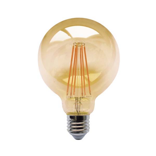 Bombilla decorativa en forma de globo de diámetro 95mm con cristal ámbar (dorado). Ideales para decorar y crear un ambiente cálido.