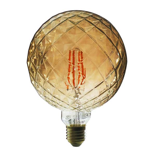 Bombilla LED globo de cristal ámbar (dorado), su cristal grabado le da un aspecto muy especial, efecto “diamante”. Filamentos LED con un consumo de solo 4W. Ideal para una iluminación muy suave o uso decorativo. Equivale a unos 30W de luz. Bombilla decorativa, ideal para aplicar en lámparas de sobremesa o colgantes donde la bombilla va vista.