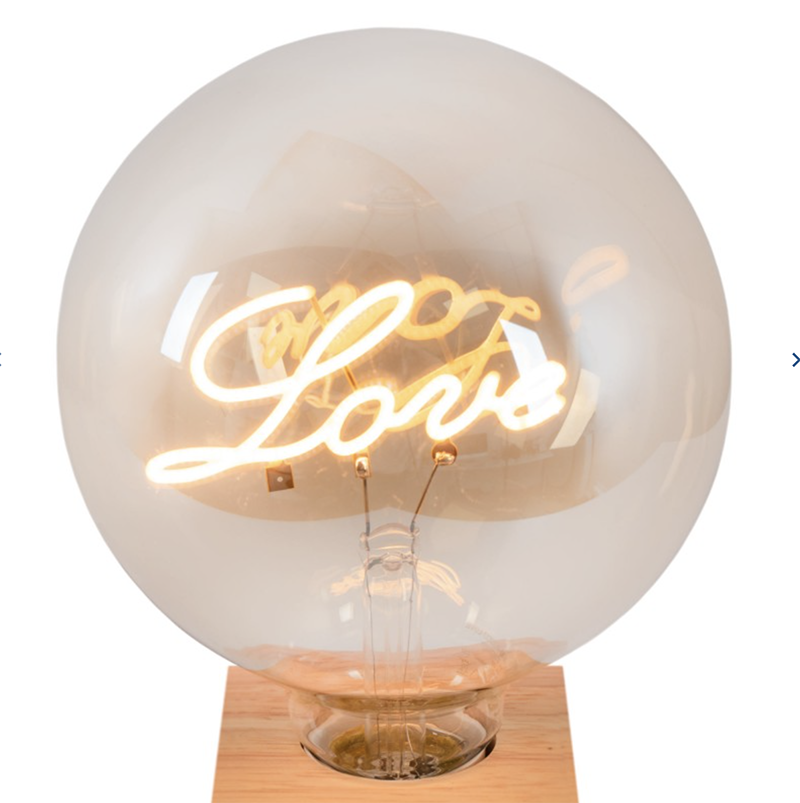 Bombilla globo LED decorativa de cristal ámbar con filamento LED formando la palabra “Love”. De luz muy suave y cálida.