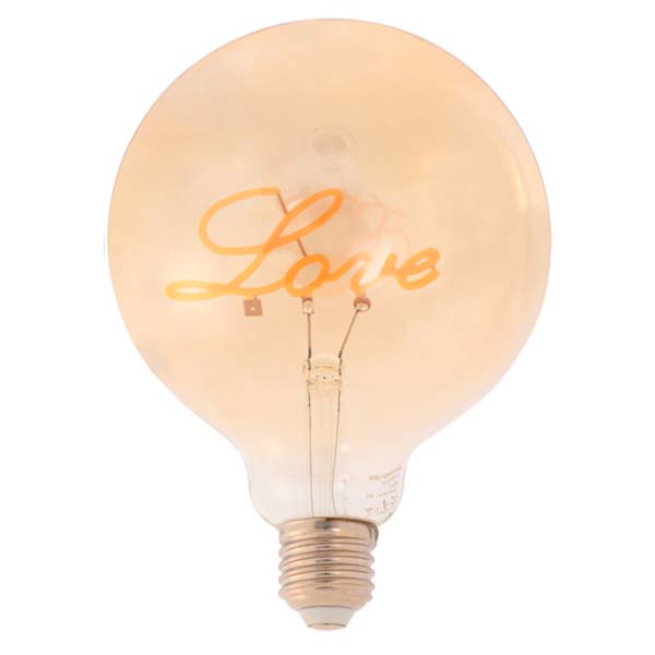 Bombilla globo LED decorativa de cristal ámbar con filamento LED formando la palabra “Love”. De luz muy suave y cálida.