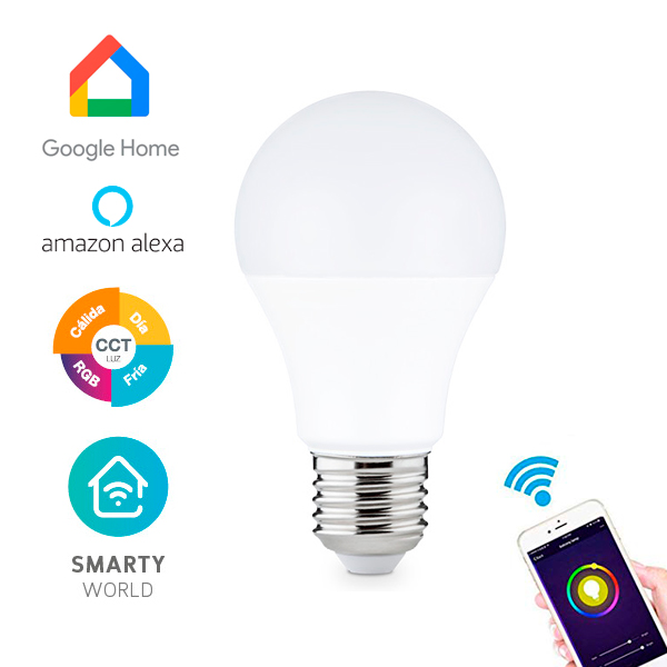 Bombilla LED WIFI inteligente. Funciona con smartphone (iPhone y Android). Compatible con Amazon Alexa y Google HOME. También funciona con Bluetooth.