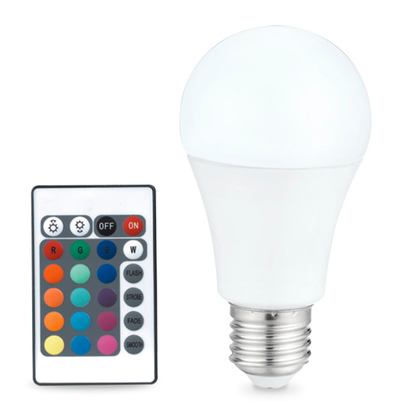 Bombilla LED standard RGB y luz de color blanca, neutra y cálida. Controlado por mando a distancia.
