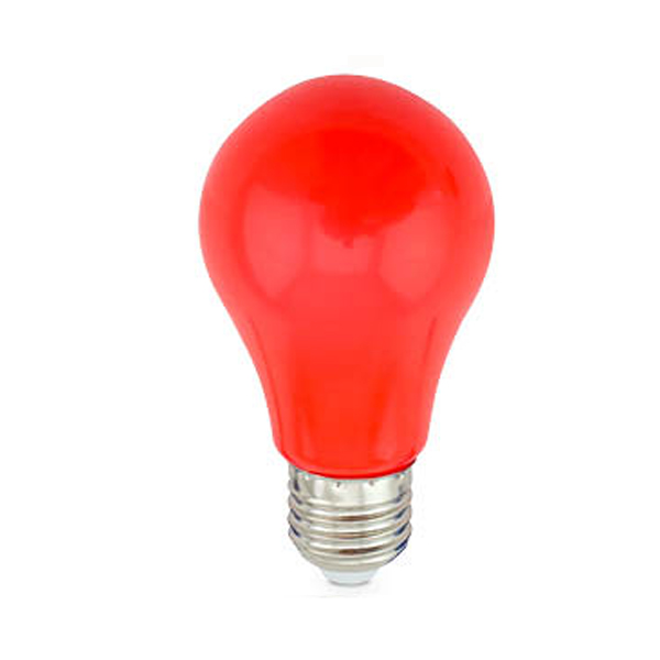Bombilla LED estándar fabricada en plástico anti-rotura de color rojo, con el mismo aspecto que las clásicas bombillas de colores.