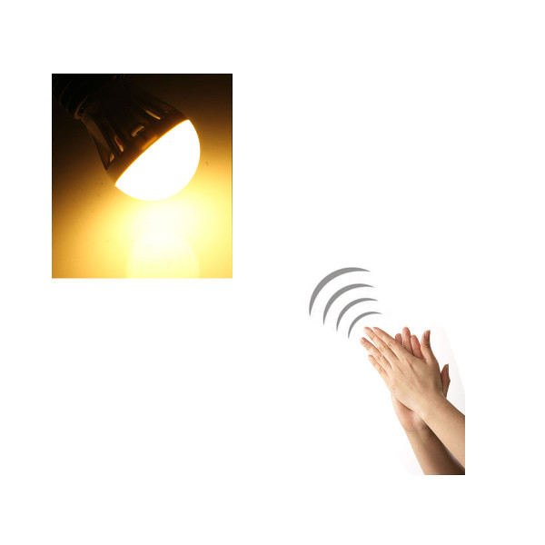 Bombilla LED con sensor de sonido que enciende la bombilla cuando detecta un sonido (palmada, voz, etc.) y la estancia esta oscura o con muy poca luz. Si hay luz solar o ambiente no se enciende. Se apaga automáticamente transcurridos unos 40 segundos sin presencia.