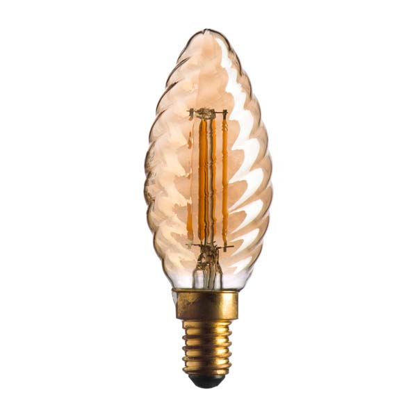 Bombilla vela decorativa, con cristal rizado, en forma de espiral, ámbar. Luz led de color cálido. Consumo de solo 4W, equivalente a unos 30W.