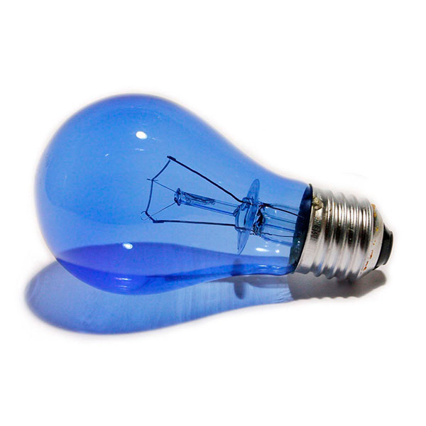 Bombilla incandescente de 40W con cristal de color azul para polarizar la luz. Conocidas como luz solar o luz día (Daylight) son ideales para estudio o trabajo. Rosca standard (E27)
