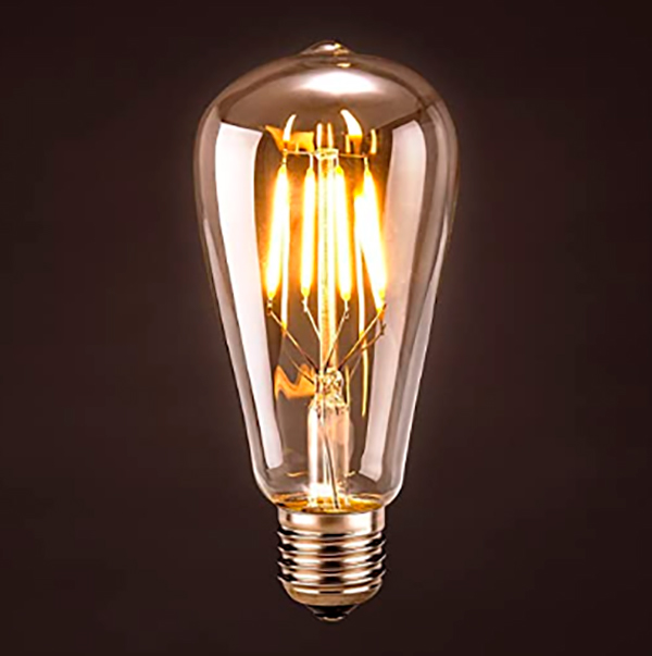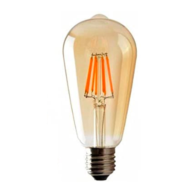 Bombilla decorativa simulando a las antiguas bombillas incandescentes. Decoran, crean ambientes, iluminan. Cristal ámbar, con forma ovoide, pebetero replica de las primeras bombillas Edison. Filamentos de micro-leds con una alta eficacia energética. Solo consumen 4W con una equivalencia de unos 40W de las antiguas bombillas. Rosca estándar E-27