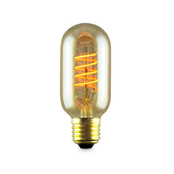 Bombilla decorativa con forma tubular de cristal ámbar (color caramelo). Filamento LED en forma de espiral. De luz cálida. Con un consumo de solo 4W  equivale a unos 30W.