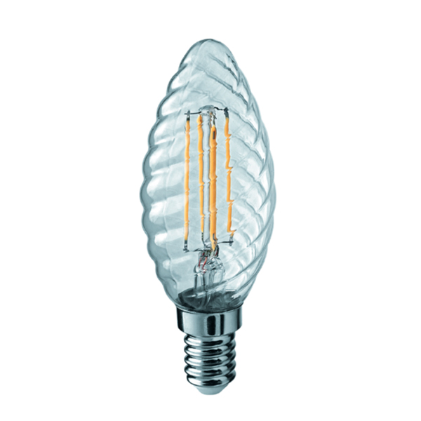 Bombilla vela decorativa, con cristal rizado, en forma de espiral, transparente. Luz led de color cálido. Consumo de solo 4W, equivalente a unos 40W.