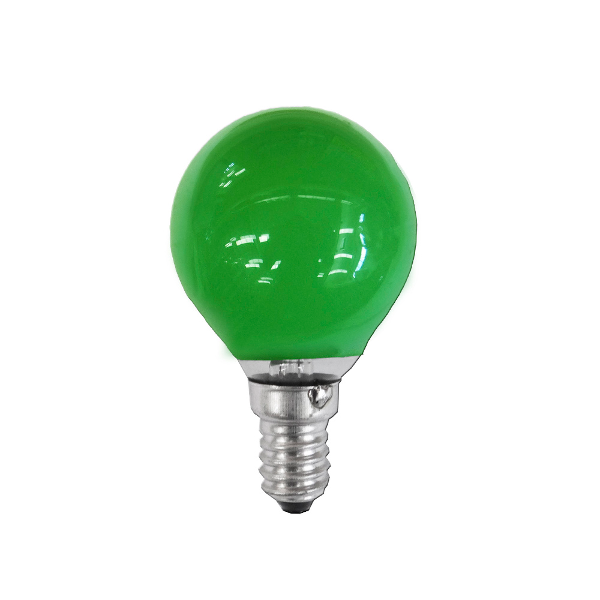 Bombilla esférica incandescente, de color verde, para casquillo E-14.