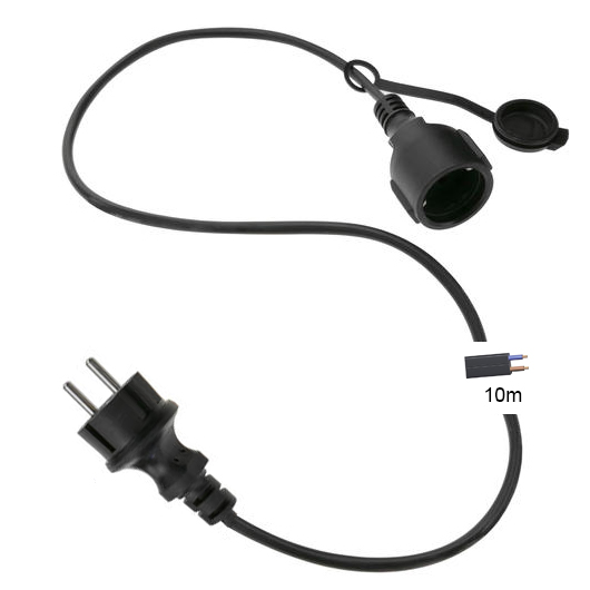 Cable plano tipo guirnalda de 10 metros con clavija y hembra montadas en sus extremos. Tanto la clavija, como la hembra son de PVC, 16A, con toma de tierra. La hembra tiene una tapa para protegerla cuando no se usa. Este cable permite añadir nuestros portalámparas tipo guirnalda de manera muy fácil, no hace falta pelar el cable ni atornillar. Sólo se roscan directamente en el cable y ya están listos para ser usados. Puedes decidir cuantos instalas y a que distancia los colocas, creando una guirnalda totalmente personalizada. En un futuro se pueden añadir más portalámparas.